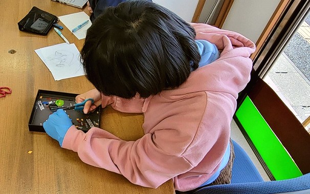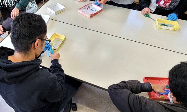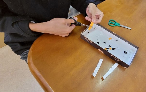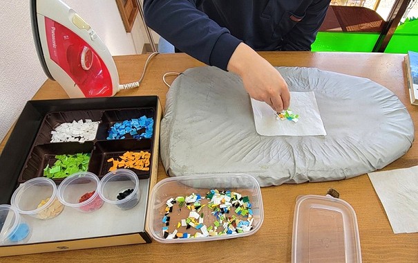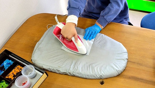 ペットボトルキャップを細かく切り、クッキングシートで挟んで、アイロンの熱で溶かし、平らに押し広げて形を整えました。キャップを細かく切る作業には少し苦労する様子も見られましたが、完成を楽しみにしながら、皆さん笑顔で取り組まれていました。