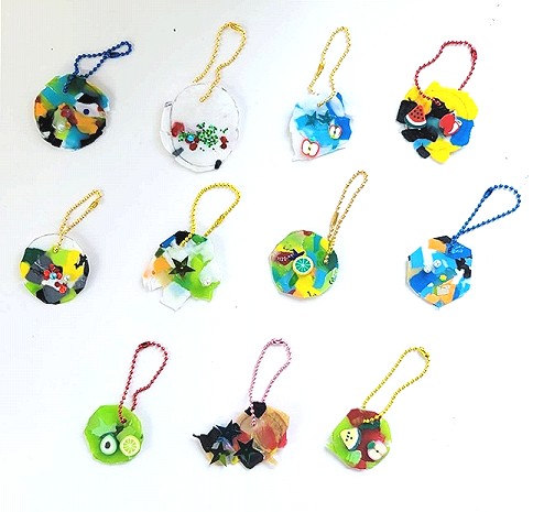 創作活動の時間に、ペットボトルキャップを再利用したキーホルダー作りを行いました。