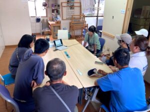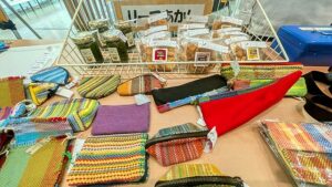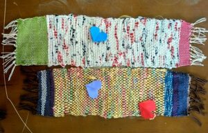 特別支援学校の実習生によるさき織り(布を裂いての織り)きれいにできました。