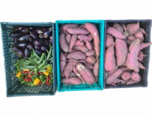 農園で特別支援学校の実習生も参加して、芋ほりをしました。また、なすびやオクラ、ししびーなども収穫しました。