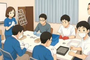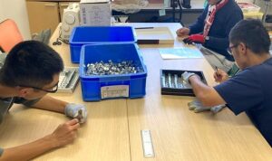 自動車用部品、今日は6人で検査作業をしました。タップ(ねじ穴)の状態を検査、みんな真剣です。